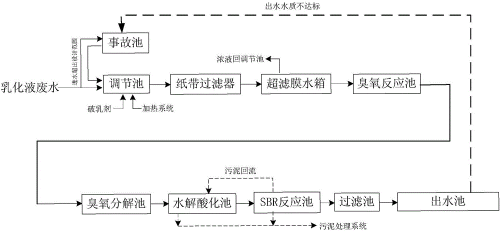 乳化液廢液用聚合氯化鋁破乳凝集的流程所示、廢乳化液經(jīng)除渣池截流雜質(zhì)和磨屑之后,流入調(diào)節(jié)池,再用泵提升到處理槽,在槽中投加聚合氯化鋁,并用壓縮空氣進(jìn)行攪拌,便廢乳化液中微油粒得以破乳凝集,通過(guò)靜置,凝聚的油滴浮升并匯成油層,由刮油板經(jīng)收油槽進(jìn)入反應(yīng)鍋再生回用。除油后的水經(jīng)砂濾池去除懸浮物后,經(jīng)活性炭吸附后進(jìn)行排放。