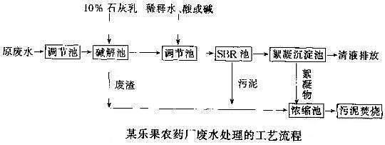 某農(nóng)藥廠生產(chǎn)樂果農(nóng)藥,生產(chǎn)過程產(chǎn)生的工業(yè)廢水先經(jīng)均質(zhì)均量調(diào)節(jié)后,進入堿解預處理池。堿解池出水經(jīng)配水稀釋使COD約為3,000mg/L,再進入序批式生物反應器(SBR),SBR出水排入絮凝沉淀池,沉降后的上清液(COD<250mg/L)可直接排放。廢渣和污泥經(jīng)焚燒處理,排除二次污染。廢水處理工藝流程如圖所示:
