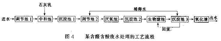 舉例說明一下:某化工廠生產(chǎn)過程中產(chǎn)生含醛含酸的廢水,廢水COD6,000mg/L,pH值1.0,該廠采用厭氧一生物濾池一氧化塘組合處理,使出水COD<100mg/L。所采用的工藝流程如圖所示:
