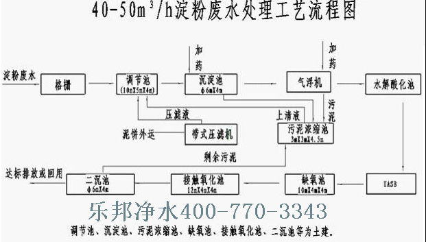 淀粉生產(chǎn)廢水本身含有機(jī)質(zhì)多、濃度高且懸浮物含量大,廢水BOD5/CODcr=0.53,可生化性較好,同時(shí)在本工程中出水水質(zhì)要求較高??紤]到以上因素,工藝選用物理與生化處理相結(jié)合的方式。物理法通過(guò)藥劑投加、絮凝氣浮工藝主要去除懸浮物、膠體物質(zhì)及部分有機(jī)物,同時(shí)回收植物蛋白飼料。針對(duì)廢水本身有機(jī)物濃度高的特點(diǎn),生化處理采用厭氧-好氧相結(jié)合的處理工藝。